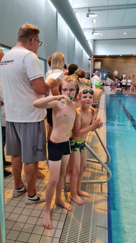 Am Sonntag ging es für das Trainerteam Markus und Anne mit ihren Sprößlingen der Trainingsgruppe GA zum Teutoburger-Wald Schwimmfest nach Georgsmarienhütte. Mit dabei waren Tristan Bindzius (Jg. 2016), Marlene Bockhorn (Jg. 2016), Finnja Fechtner (Jg. 2016), Marla Menninghaus (Jg. 2016), Johannes Mönkediek (Jg. 2016), Noel Rakow (Jg. 2016), Lucia Fee Sandfort (Jg. 2015) und Emma Winter (Jg. 2016). Sie präsentierten ihr Können in den Disziplinen 50 m Rücken, Brust und Freistil. Der Nachwuchs zeigte einen tollen Teamzusammenhalt, da sich alle mit viel Spaß gegenseitig unterstützt und mit Begeisterung angefeuert haben. Die Stimmung in der Halle war bestens. Ebenso präsentierten die Schwimmer*innen eine deutliche Weiterentwicklung der Technik, die sich beispielsweise in schnelleren und sichereren Wenden oder im Dreier-Zug in der Schwimmart Freistil festmachte. Anne und Markus haben sehr gut an den grundlegenden schwimmerischen Fertigkeiten gearbeitet, so dass wir sehr gespannt sein können, wie die Kinder ihr Potenzial in der aktuellen Saison weiter entwickeln können.