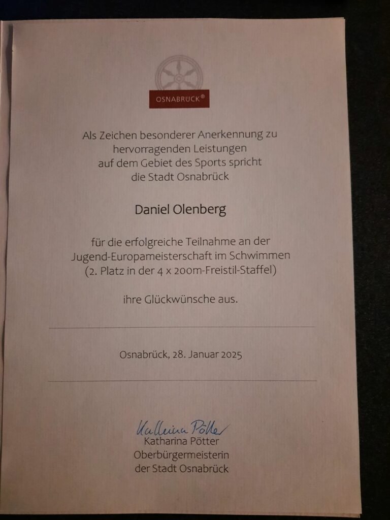 Die Oberbürgermeisterin Katharina Pötter zeichnete Daniel für seinen Vize-Jugendeuropameistertitel in der 4×200 F Staffel in Vilnius 2024 aus. Im Osnabrücker Friedensaal des Rathauses wurde ihm nach einer persönlichen Rede mit Danksagung als sportliches Vorbild und Gratulation für seine Leistungen die Sportehrenplakette der Stadt Osnabrück übergeben.