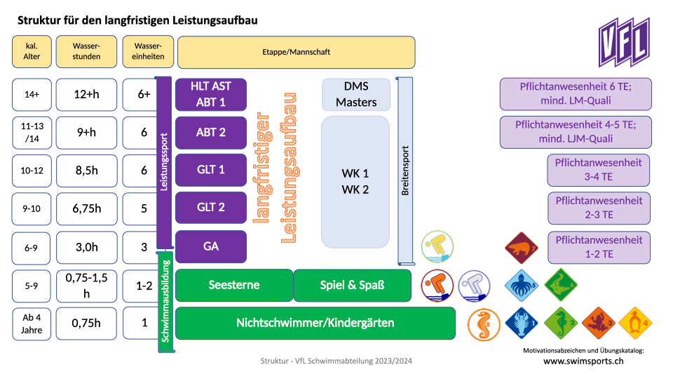 - Ausbau sporttechnischer Fertigkeiten: In den Breitensportgruppen des VfL Osnabrück trainieren wir alle Elemente des Wettkampfsports Schwimmen. Die vier Schwimmarten, Delphin-, Rücken-, Brust- und Kraulschwimmen -, werden in Grob- und Feinform gelehrt. Zum Curriculum gehören auch Starts, Wenden und Delphinkicks.