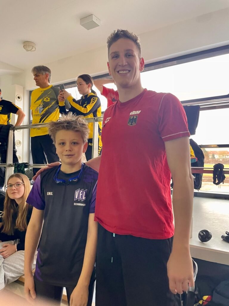 Neben den eigenen Rennen sorgten auch besondere Begegnungen für Motivation: In Magdeburg trafen unsere lila weißen Athleten unter anderem auf die Schwimmstars Lukas Märtens , Johannes Liebmann oder auch Florian Wellbrock, die vor Ort präsent und selbst im Wasser aktiv waren. Solche Momente bleiben im Kopf und zeigen, wohin der Weg mit Disziplin und Leidenschaft führen kann.