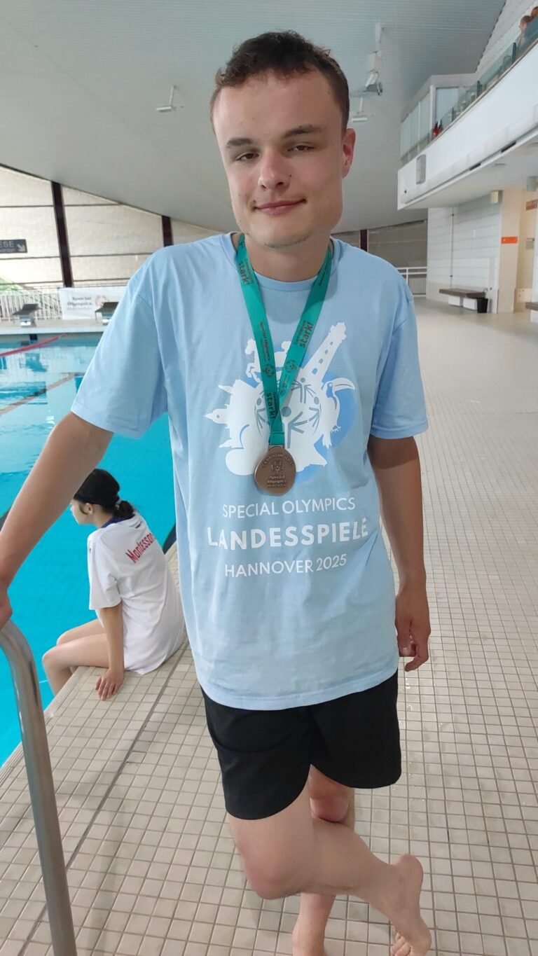Bei den diesjährigen nds. Landesspielen der Special Olympics (SOD) in Hannover erreichte Luca Rabe die Bronzemedaille über 100m Brust. Die 50m Brust wird er im Oktober in Hamburg nachholen. Damit