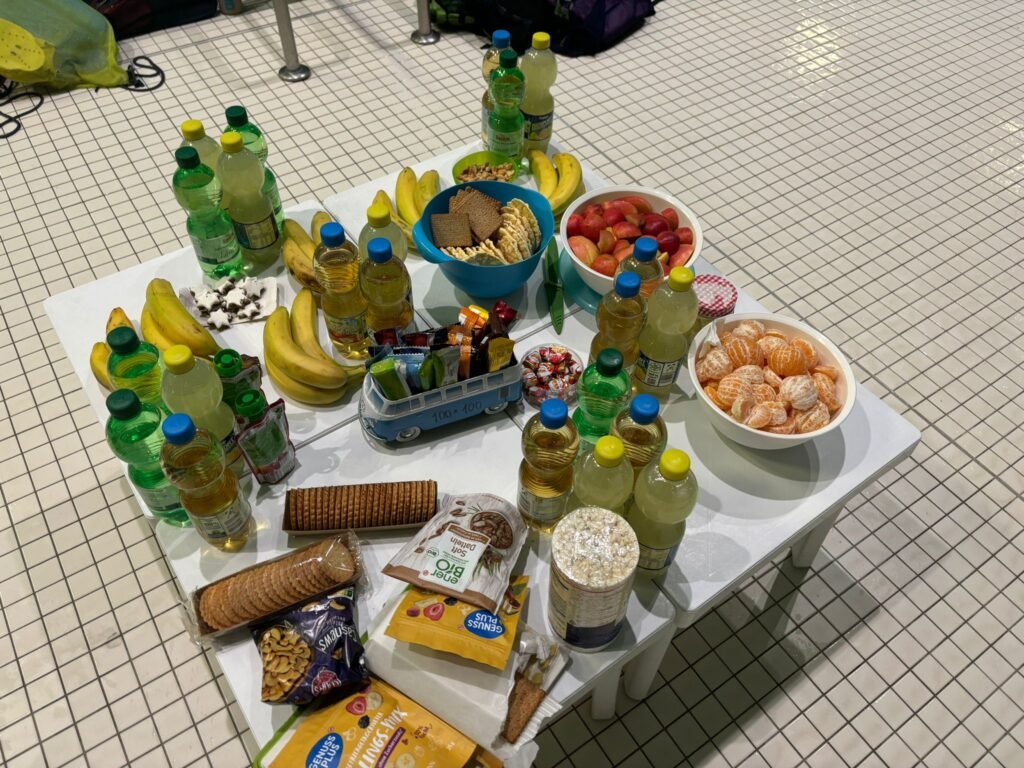 Nach erfolgreicher Bewältigung wartete auf die lila-weißen Aktiven ein kleines Buffet zur Kräftigung mit Obst, Müsliriegel, Nüssen, Schokolade und Getränken. Vielen Dank hier an Anne und Bianca.